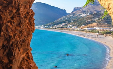 The retreat takes place in Plakias, a village on Crete’s southern coast with over 300 days of sunshine a year. Paligremnos Beach is within walking distance; Souda and the legendary Preveli — with its palm‑lined river gorge — are close by. The bay is held between two dramatic headlands: Kako Mouri to the east, and to the west, the rock formation locals call the Dragon, where each evening the sun descends into the sea. On clear days, from the beach, you can see Gavdos — the southernmost point of Europe, closer to Africa than to Athens — floating on the horizon.