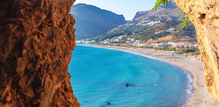 And then, suddenly, the gorge opens. Light expands. The wide crescent of Plakias Bay appears below, and the Libyan Sea stretches south toward Africa. By the time you reach the shoreline, something in the body has already shifted — quietly, unmistakably — before the first session has begun.